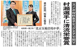【2021年11月13日掲載】村瀬選手に清流栄誉賞 岐阜第一高2年、スノボW杯女子ビッグエアで初V「北京五輪出場が夢」