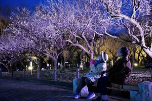 梅の名所として知られる岐阜市梅林南町の梅林公園で、ライトアップイベントが10日夕から始まった。梅の開花は早咲きの品種が三~五分咲きで、ライトアップにより木々が鮮やかなピンクや暖色系のオレンジの明かりに照らされ、一層温かみが感じられる空間が広がっている。