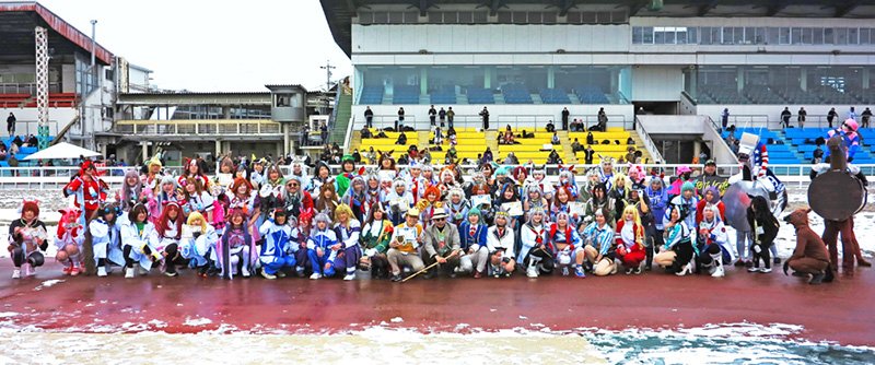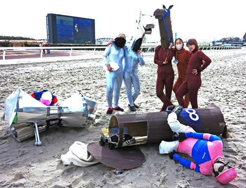 その盛り上げに貢献し、熱い視線を浴びた「ハリボテ」の2頭。イベントなどでのコスプレ仲間でもある宿敵との初対決で完勝したハリボテエナジー。リーダーら3人は「レースでは初めて対戦しました。馬場が重かった。勝てて良かったが、賞(昨年の仮装優秀者賞)を逃したのが残念でした。でも(ハリボテの)どっちかが取ったら、けんかになるんで」と、まずはちゃんとスタートラインに立って無事完走できた喜びと笑顔にあふれていた。