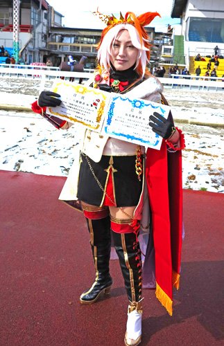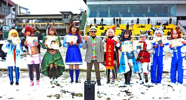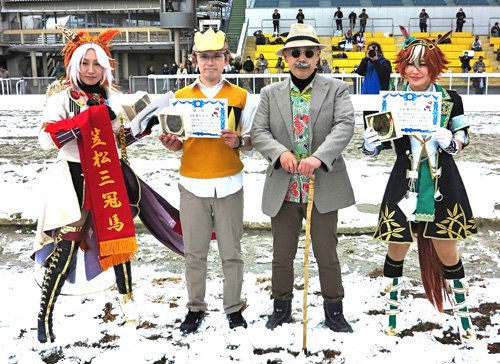 殊勲賞はスーパークリーク姿で目立っていた東京都の女性。ガッツポーズでの1着ゴールの快走ぶりと、あでやかなコスプレで雪上レースを盛り上げてくれた。敢闘賞はゴールドシップ姿の安城市の女性。転倒での完敗から今回は優勝を飾り、表彰式後の気合乗りも満点で「ゴルシ推し」がよく伝わった。敢闘賞にはもう一人。笠松時代のオグリキッャプ姿の尾張旭市の女性。オグリと同じように初戦2着から2戦目で巻き返し、初勝利を飾った勝負根性に拍手。