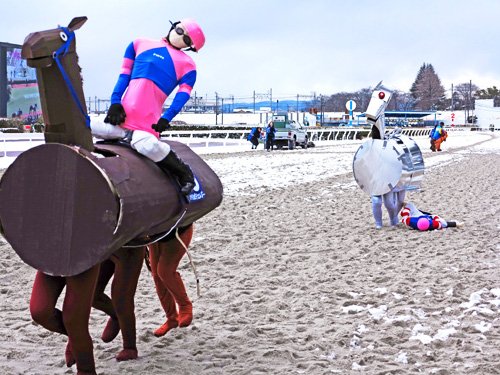 雪上レースでもあり、寒さの中、ハリボテ2頭は出走準備から大変そうだったが、それぞれ持ち味を発揮し最高のパフォーマンスを披露してくれた。馬券の発売はなくても「実績上位」の予想通り、過去2回の経験を生かしたハリボテエレジーが軽やかなフットワークでメカハリボテに先着した。