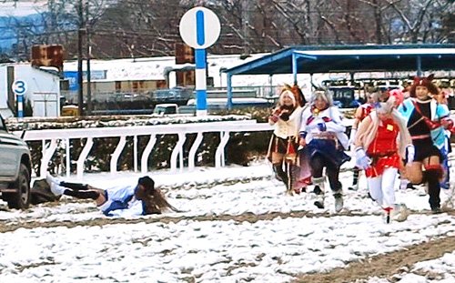 全国的に早朝からの降雪で京都、東京競馬場のJRAレースは中止となった。ところが「ウマ娘の楽園」でもある笠松競馬場は別天地。笠松町は「仮装の宴2026は予定通り開催します」と参加者を歓迎。新春ファミリーマラソン大会に続いて、寒さを吹き飛ばす熱いレースを繰り広げたが、まさかのスノーダートで転倒するウマ娘も相次いだ。