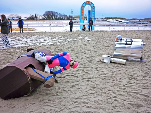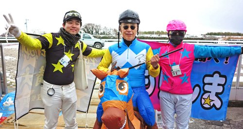 「笠松の騎手のコスプレをしたら盛り上がると、応募したら当たっちゃいました」という明星騎手の勝負服姿で挑んだ岐阜市の男性。苦戦しながら追い上げたレース後「こんなに足を取られる中で、お馬さんはすごいなと。雪がない所を選んで走ったが、足が埋まっちゃって追い込み不発でした」と残念がった。