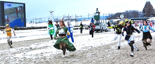 ここは39年前、オグリキャップが8回も1着で駆け抜けた笠松競馬場。その聖地の同じコースにコスプレで着飾ったウマ娘たちが降臨。雪上での50メートル競走となって「真冬の大冒険」。未明から降り積もった雪や深い砂と格闘しながらゴールへ疾走した。