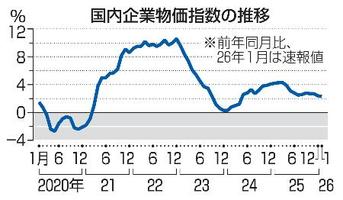 1月企業物価2・3%上昇 コメ高水準、伸び縮小 2026年2月12日 09:13 国内企業物価指数の推移 日銀が12日発表した1月の国内企業物価指数(2020年平均=100、速報)は前年同月比2・3%上昇の128・4だった。高水準なコメ価格が農林水産物を押し上げた。伸び率は25年12月の2・4%から0・1ポイント縮小した。 企業物価指数は、企業間で取引される商品の価格水準を示す。家庭が購入するモノやサービスの価格動向を表す消費者物価指数の先行指標とされる。 トップ 全国のニュース 1月企業物価2・3%上昇 関連記事 タイ、学校で発砲3人死傷 「緊張感持って市場注視」 中国の大阪総領事、公の場に バングラデシュ再建へ投票開始 米移民当局に納税者データ提供 アサヒビール類販売11%減 おすすめ記事 「1日貸し切り鵜飼」今年も販売します 岐阜市が事業者募集、料金は昨年より安く 岐阜県、養鶏場の一斉消毒開始 関市の鳥インフル受け100ヵ所 春を先取り 岐阜市・梅林公園で幻想的ライトアップ 岐阜市の寺院で「福だるま供養」 安全や幸せ願う
