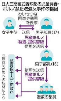女子生徒にわいせつ動画を送らせ拡散したなどとして、警視庁は12日、児童買春・ポルノ禁止法違反(製造や提供)の疑いで、日大三高(東京都町田市)の硬式野球部の17歳と16歳の男子部員2人を書類送検した。捜査関係者への取材で分かった。日大三高は昨夏の甲子園の準優勝校。動画は部員数十人が受け取り、拡散には十数人が関わったとみられる。