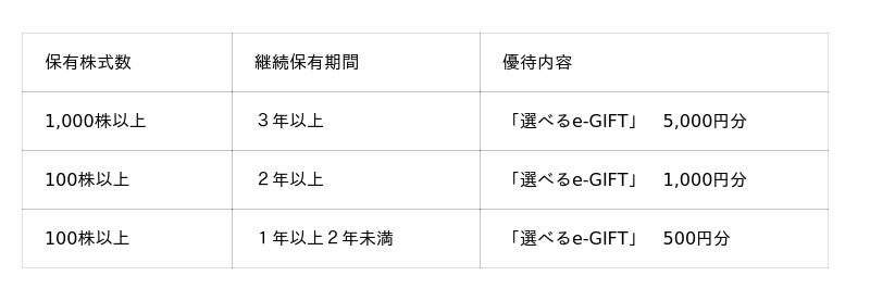 保有株式数および継続保有期間に応じて、デジタルギフトカード「選べるe-GIFT」を以下のとおり進呈いたします。