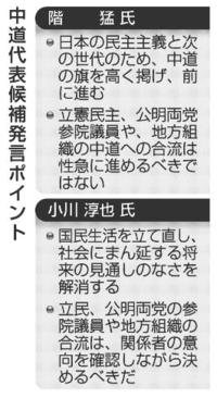 中道代表選に階、小川氏 党勢回復策争点 きょう投開票 2026年2月13日 05:00 中道改革連合の代表選立候補の届け出後、共同記者会見で握手する小川淳也氏(左)と階猛氏=12日午前、東京・永田町の党本部 中道改革連合の代表選が12日告示... 残り784文字(全文:801文字) この記事をお読みいただくには「デジタルプラン」または「宅配+デジタルプラン」の会員登録が必要です。無料会員の方はログインしてマイページからコース変更してください。デジタルプランまたは宅配+デジタルプランをご登録中の方はログインしてください。 岐阜新聞デジタル会員に登録すると 無料会員向け記事が読める ニュースレターで最新情報が受け取れる デジタルプラン、宅配+デジタルプランなら Webオリジナルコンテンツが読める 紙面ビューアが読める チケットの先行発売に参加できる お得なクーポンが使える 新規登録ページ ログインページ トップ 岐阜のニュース 中道代表選に階、小川氏 党勢回復策争点 きょう投開票 関連記事 特殊詐欺疑い8人逮捕 三重県警 被害10億円以上か 元施設長と元職員有罪 岐阜地裁 羽島入所者暴行で判決 長崎沖で中国漁船拿捕 水産庁 船長を逮捕、釈放 入札妨害の疑いで業者4人書類送検 弥富市談合 訃報 久松夕子さん 訃報 杵屋響泉さん おすすめ記事 FC岐阜15日ホーム開幕戦で磐田に挑む 2試合連続の「下剋上」なるか 大垣市の守屋多々志美術館、最後の企画展 3月末に閉館、歴史画や季節の花など華やかな展示 陥没した道路に車転落、救助方法は? 岐阜市消防本部と県警、企業が対応訓練 行真よく頑張った モーグル「銅」、古里・池田町からパブリックビューイングで大声援 【ミラノ冬季五輪】