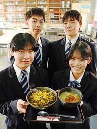 揖斐高校(揖斐川町三輪)生活デザイン科食物コースの3年生4人は、道の駅「星のふる里ふじはし」(同町東横山)と連携し、旧徳山村で栽培されていたトウガラシ「徳山なんば」を活用した「キンパ風丼と水餃子(ぎょうざ)の旨(うま)辛なんばセット」を考案した。同道の駅で販売しており、売れ行きは好調。生徒たちは「徳山なんばの辛さの奥深さを味わって」と話す。