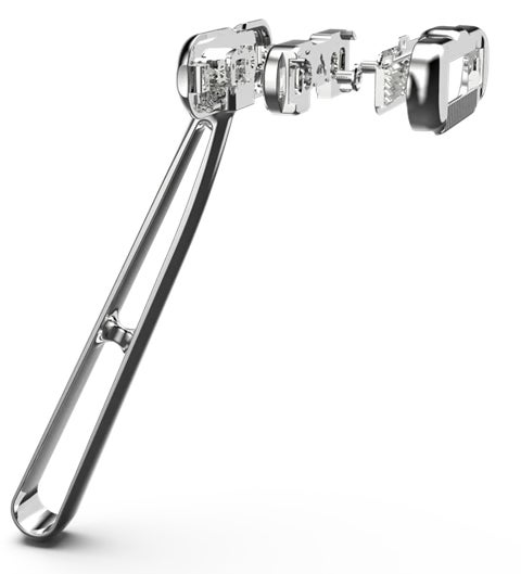5枚刃でありながら約1.7mm、1.0gと超薄型・軽量の替刃。少ないパーツのシンプル構成のため低コスト化。替刃容器は使い捨てコンタクトにヒントを得た形態。保管や持ち運びにも便利。