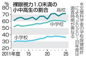 学年別に見ると、裸眼視力1・0未満の割合は小1の24・09%から学年が上がるにつれて増え、小6は48・03%、中3は64・91%。高3では71・89%となった。0・3未満は小学生10・14%、中学生26・76%、高校生42・35%だった。