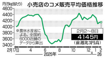 コメ5キロ4145円 全国小売店平均 2026年2月14日 05:00 農林水産省は13日、全国約6千の... 残り234文字(全文:251文字) この記事をお読みいただくには「デジタルプラン」または「宅配+デジタルプラン」の会員登録が必要です。無料会員の方はログインしてマイページからコース変更してください。デジタルプランまたは宅配+デジタルプランをご登録中の方はログインしてください。 岐阜新聞デジタル会員に登録すると 無料会員向け記事が読める ニュースレターで最新情報が受け取れる デジタルプラン、宅配+デジタルプランなら Webオリジナルコンテンツが読める 紙面ビューアが読める チケットの先行発売に参加できる お得なクーポンが使える 新規登録ページ ログインページ トップ 岐阜のニュース コメ5キロ4145円 全国小売店平均 関連記事 秋吉台山焼きで消防団員が死亡 「体に火が付いた」 静岡で強盗か 住人殴り逃走 男性軽傷 速度違反摘発で不正 神奈川県警 虚偽書類作成か 郡上・ホワイトピアジュニアクラブ 1期生の活躍に沸く 当時から「考えて滑っていた」 田久保前市長 強制捜査 静岡県警、自宅を捜索 学歴詐称疑惑 かけ子を脅し連行疑い カンボジア詐欺 男2人逮捕 おすすめ記事 村瀬心椛/堀島行真/松浦透磨 同じ母校・岐阜第一高から五輪へ、恩師から見た共通項は? 「青氷の滝」飛騨の寒さがつくる神秘的光景 高山市高根町の岸壁に出現 第76回岐阜新聞大賞、郷土発展への功績たたえる 岐阜市で贈呈式 浅野撚糸の施設「フタバスーパーゼロミル」が福島県の建築文化賞・復興賞受賞 原発事故被害、帰還する住民の働く場提供