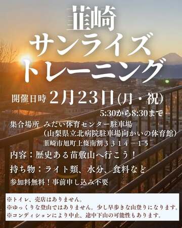 韮崎市では、早朝の自然の中で心身を整える「韮崎サンライズトレーニング」を実施しています。
