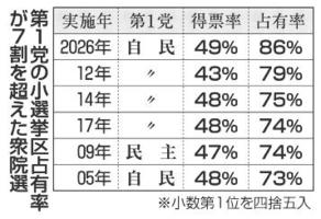 自民に小選挙区制の恩恵 衆院選、得票率49%で議席86% 中選挙区制復活の機運下がる 2026年2月15日 05:00 自民党は衆院選の小選挙区で、全国... 残り639文字(全文:656文字) この記事をお読みいただくには「デジタルプラン」または「宅配+デジタルプラン」の会員登録が必要です。無料会員の方はログインしてマイページからコース変更してください。デジタルプランまたは宅配+デジタルプランをご登録中の方はログインしてください。 岐阜新聞デジタル会員に登録すると 無料会員向け記事が読める ニュースレターで最新情報が受け取れる デジタルプラン、宅配+デジタルプランなら Webオリジナルコンテンツが読める 紙面ビューアが読める チケットの先行発売に参加できる お得なクーポンが使える 新規登録ページ ログインページ トップ 岐阜のニュース 自民に小選挙区制の恩恵 衆院選、得票率49%で議席86% 中選挙区制復活の機運下がる 関連記事 真っ向勝負 両親「お疲れさま」 果敢な滑りに感動 平昌後 会社辞め支えた恩師 輝くほど「第2の行真出る」 熱海土石流起点の土地旧所有者 コロナ助成詐取疑い逮捕 トラックと車が衝突、21歳重体 岐阜市、国道21号交差点 遮断機下りず電車通過 JR福知山線、始発から6本 おすすめ記事 【速報】村瀬心椛が決勝進出 スノーボード女子スロープスタイル【ミラノ冬季五輪】 【速報】堀島が銀メダル 男子デュアルモーグル【ミラノ冬季五輪】 FC岐阜、ホーム初戦も白星 J2・J3百年構想リーグ 岐阜県唯一の屋外スケート場、今冬の滑り納めは暖かな一日