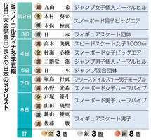 日本、メダルラッシュ 冬季最多射程圏、光る団結力 第8日終え14個 2026年2月15日 05:00 男子ビッグエアで金メダルを獲得した木村葵来選手(左)と銀メダルの木俣椋真選手=7日、同 スノーボード女子ビッグエアで獲得した金メダルをかじるポーズで笑顔の村瀬心椛選手=9日、イタリア・リビーニョ(共同) ミラノ・コルティナ冬季五輪の日本... 残り1057文字(全文:1074文字) この記事をお読みいただくには「デジタルプラン」または「宅配+デジタルプラン」の会員登録が必要です。無料会員の方はログインしてマイページからコース変更してください。デジタルプランまたは宅配+デジタルプランをご登録中の方はログインしてください。 岐阜新聞デジタル会員に登録すると 無料会員向け記事が読める ニュースレターで最新情報が受け取れる デジタルプラン、宅配+デジタルプランなら Webオリジナルコンテンツが読める 紙面ビューアが読める チケットの先行発売に参加できる お得なクーポンが使える 新規登録ページ ログインページ トップ 岐阜のニュース 日本、メダルラッシュ 冬季最多射程圏、光る団結力 第8日終え14個 関連記事 真っ向勝負 両親「お疲れさま」 果敢な滑りに感動 平昌後 会社辞め支えた恩師 輝くほど「第2の行真出る」 熱海土石流起点の土地旧所有者 コロナ助成詐取疑い逮捕 トラックと車が衝突、21歳重体 岐阜市、国道21号交差点 遮断機下りず電車通過 JR福知山線、始発から6本 おすすめ記事 【速報】村瀬心椛が決勝進出 スノーボード女子スロープスタイル【ミラノ冬季五輪】 【速報】堀島が銀メダル 男子デュアルモーグル【ミラノ冬季五輪】 FC岐阜、ホーム初戦も白星 J2・J3百年構想リーグ 岐阜県唯一の屋外スケート場、今冬の滑り納めは暖かな一日