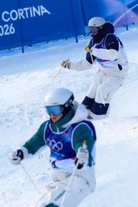 男子デュアルモーグル1回戦 コブを攻める藤木豪心(奥)=リビーニョ(共同)