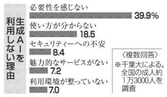 生成AI、利用は2割 18歳以上調査 年齢や生活環境で差 2026年2月16日 05:00 インターネットを使う成人のうち、... 残り589文字(全文:606文字) この記事をお読みいただくには「デジタルプラン」または「宅配+デジタルプラン」の会員登録が必要です。無料会員の方はログインしてマイページからコース変更してください。デジタルプランまたは宅配+デジタルプランをご登録中の方はログインしてください。 岐阜新聞デジタル会員に登録すると 無料会員向け記事が読める ニュースレターで最新情報が受け取れる デジタルプラン、宅配+デジタルプランなら Webオリジナルコンテンツが読める 紙面ビューアが読める チケットの先行発売に参加できる お得なクーポンが使える 新規登録ページ ログインページ トップ 岐阜のニュース 生成AI、利用は2割 18歳以上調査 年齢や生活環境で差 関連記事 音楽、何で聴いてる?カセット、CD、サブスクの時代へ 日本は物理媒体が存在感 喫茶店に新メニュー「腸活&ビジュ華やか」若者向け登場 岐阜市内3店で数量限定 FC岐阜、J2勢連破 川本、点取り屋の本領 J2・J3百年構想リーグ ◇フットサル メットライフ生命Fリーグ WBC代表合宿 曽谷や種市ら精力的に投球 キャンプだより 小田巧打 持ち味見せた おすすめ記事 郡上市北部の小規模校、不登校ゼロ、転退学もゼロ! 「この10年で変わった」その理由とは 【ぎふ高校研究】 堀島「金メダルは次回に持ち越し」 岐阜への思いも語る デュアルモーグル「銀」で会見【ミラノ冬季五輪】 猫田岐阜県議が15選目指し立候補表明 来春の県議選大垣市選挙区 村瀬心椛選手に県民栄誉大賞授与へ 江崎知事が方針 ミラノ冬季五輪「金」