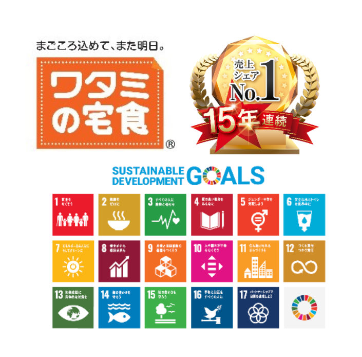 「ワタミの宅食」について「ワタミの宅食」は、日替わりのお食事と “まごころ” をお届けすることで“社会を支えるインフラ” となることを目指し、事業を展開しています。お客さまと同じ地域に住む“まごころスタッフ”が毎日、個人宅・施設などへお食事をお届けしています。毎日約21万食以上のお食事をお届けしており、病者・高齢者食宅配市場「売上シェア15年連続 No.1」(2010年~2024年)※を達成しています。2020年3月には、業界として初めて、自社弁当容器を回収し、新たな容器としてリサイクルする取り組みを全国に展開するなど、SDGsの目標達成にも貢献しています。