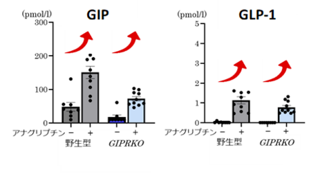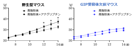 ・肥満マウスを用いた実験により、DPP-4阻害薬による血糖改善および体重増加抑制効果の発現には、内因性GIPシグナルが不可欠であることを明らかにしました。