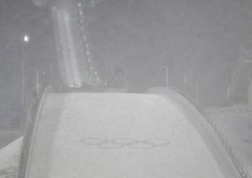 スタート位置に座った選手のヘルメットに積もるほどの降雪。助走路に雪がたまって助走速度が出づらくなり、雪の中で飛んだ選手は極端に飛距離を落としていた。審判によるスタート位置の高さの判断も困難を極めたという。