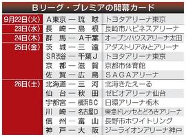 バスケットボールBリーグは17日、秋にスタートする新1部「Bリーグ・プレミア(Bプレミア)」などの日程を発表し、新1部は9月22日にA東京―琉球(トヨタアリーナ東京)で開幕することが決まった。2016年のリーグ創設1季目の開幕日と同日、同一カードに設定し、島田慎二チェアマンは「どのぐらい進化したか分かりやすい。このカードはベストだと思っている」と話した。