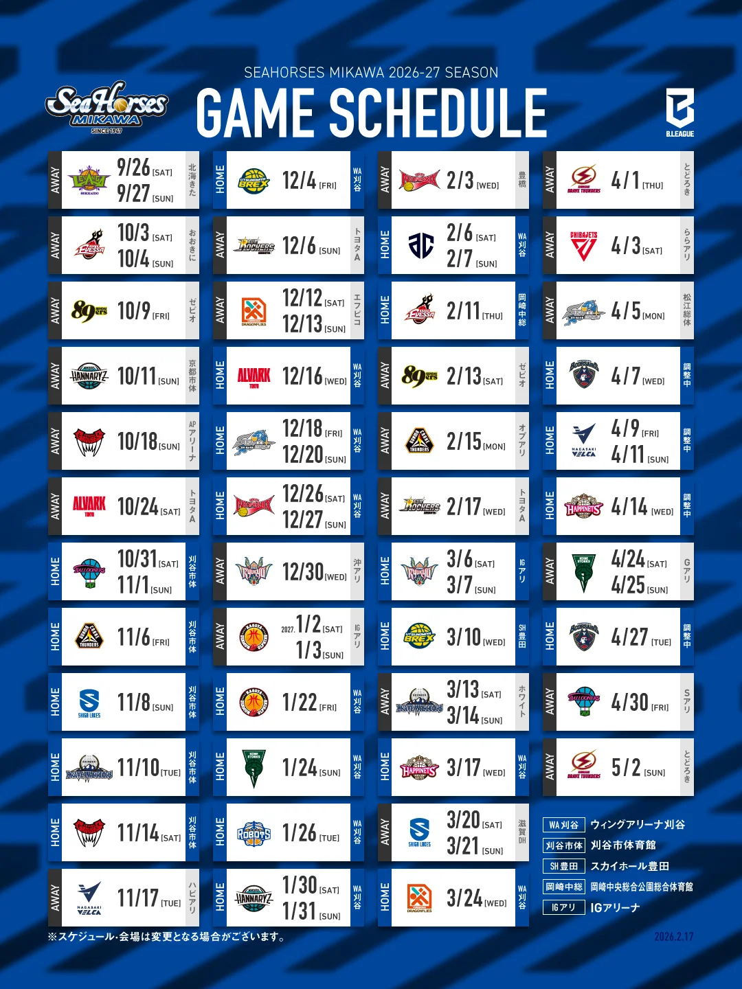 シーホース三河の開幕戦は9月26日(土),27日(日)のアウェー・レバンガ北海道戦となります。