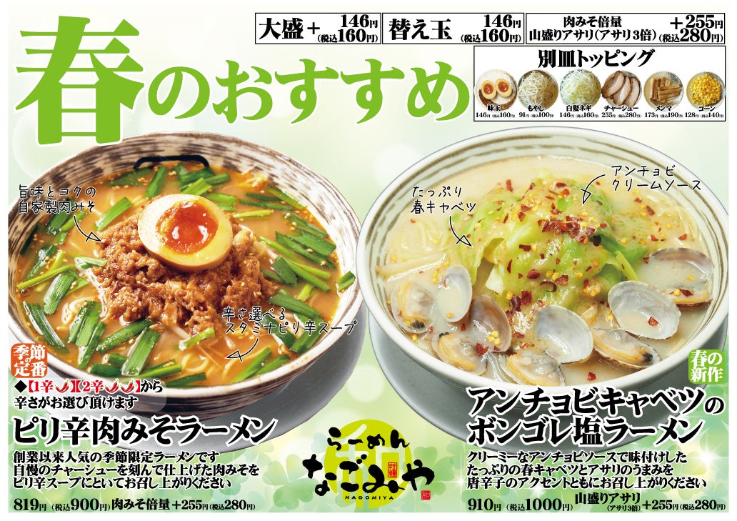 愛知県にて飲食店を展開する株式会社プレジャー(本社:愛知県尾張旭市、代表:小山和紀)が運営する、愛知県春日井市【らーめんなごみや高蔵寺店】は2026年3月7日(土)より、【春のおすすめ】メニューを販売開始いたします。