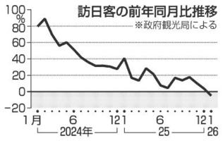 訪日客4年ぶりマイナス 1月4.9%減中国は60%減 2026年2月19日 05:00 政府観光局は18日、1月に日本を... 残り588文字(全文:605文字) この記事をお読みいただくには「デジタルプラン」または「宅配+デジタルプラン」の会員登録が必要です。無料会員の方はログインしてマイページからコース変更してください。デジタルプランまたは宅配+デジタルプランをご登録中の方はログインしてください。 岐阜新聞デジタル会員に登録すると 無料会員向け記事が読める ニュースレターで最新情報が受け取れる デジタルプラン、宅配+デジタルプランなら Webオリジナルコンテンツが読める 紙面ビューアが読める チケットの先行発売に参加できる お得なクーポンが使える 新規登録ページ ログインページ トップ 岐阜のニュース 訪日客4年ぶりマイナス 1月4.9%減中国は60%減 関連記事 ◇サッカー SOMPO・WEリーグ第17節第1日 ◇サッカー アジア・チャンピオンズリーグ・エリート きょうのスポーツ カーリング 日本6敗目1次L敗退 女子 ミラノ・コルティナ冬季五輪2026 第14日見どころ ミラノ・コルティナ冬季五輪2026 第14日・19日の日程 おすすめ記事 村瀬心椛選手の地元、深夜の大声援 岐阜市でパブリックビューイング 二つのメダル「素晴らしい偉業」 【ミラノ冬季五輪】 【速報】村瀬心椛「銅」女子スロープスタイル ビッグエアに続くメダル獲得 19歳の深田茉莉が「金」【ミラノ冬季五輪】 女子スキーHP・桐山/女子スキークロス・新井、20日に五輪初出場 同僚らエール【ミラノ冬季五輪】 岐阜大2次4.7倍 国公立志願者数確定【県内大学一般入試志願状況を掲載】