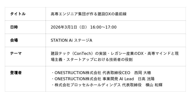 高専人が持つ技術力と実践力を結集し、人材・テクノロジー・ものづくりの領域で事業を展開する株式会社プロッセルホールディングス(本社:新潟県新潟市、代表取締役CEO:横山和輝)は、2026年3月1日(日)に開催される高専人会総会「KOSENJIN SUMMIT 2026」の分科会において、代表の横山が登壇することをお知らせいたします。登壇する分科会は「高専エンジニア集団が作る建設DXの最前線」です。