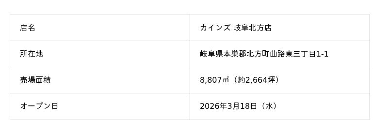 株式会社カインズ(本部:埼玉県本庄市、代表取締役社長 CEO:高家 正行)は、カインズ 岐阜北方(ぎふきたがた)店が2026年3月18日(水)に、岐阜県本巣郡北方町(もとすぐんきたがたちょう)にオープンすることをお知らせします。