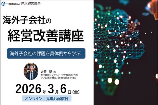 一般社団法人日本経営協会(NOMA)(所在地:東京都渋谷区、会長:高配 豪久)は、2026年3月6日(金)に「海外子会社の経営改善講座~海外事業の環境の変化の中でも対応できる知識・ノウハウを体系的に1日でマスターする~」を開催いたします。