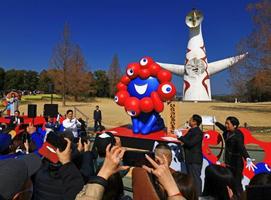 万博記念公園で開かれた「ミャクミャク」像の移設セレモニー=21日午前、大阪府吹田市