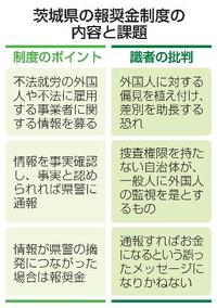 茨城県は2026年度から、不法就労する外国人に関する情報を募り、県警の摘発につながった場合に謝礼を支払う「通報報奨金制度」を始める。不法就労の外国人が全国最多という背景がある一方で、識者からは差別や偏見を助長し、監視を奨励する恐れがあるとの批判がある。