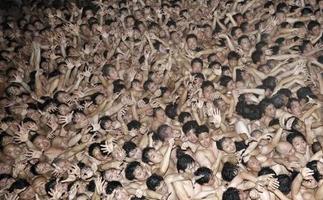 大勢の観客に見守られる中、白いまわしを着けた男たちが「わっしょい、わっしょい」とかけ声を上げながら境内に入った。冷水で身を清めると本堂へ向かい、宝木の投下を待った。