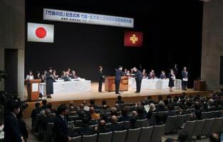 式典で丸山知事は「領土問題は政府レベルの話し合いや交渉が不可欠」と主張。竹島の日の閣議決定など、問題解決に向けた政府の主体的な取り組みが速やかに実行されるよう求めた。