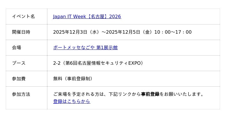 セキュリティ教育クラウド「セキュリオ」を提供するLRM株式会社(本社:兵庫県神戸市、代表取締役:幸松哲也)は2026年2月25(水)~27日(金)の3日間、ポートメッセなごやで開催される「Japan IT Week 名古屋 2026」内の「第6回名古屋情報セキュリティEXPO」にて、セキュリティ教育クラウド「セキュリオ」を出展することをお知らせいたします。
