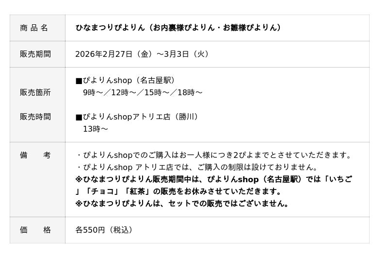 ジェイアール東海フードサービス株式会社(本社:愛知県名古屋市、代表取締役社長:岩下賢一)は、2021年以来の登場となる「ひなまつりぴよりん」を、2026年2月27日(金)から3月3日(火)までの期間限定で販売いたします。ぴよりんアトリエのパティシエが「また皆さまにお届けしたい」と思い続けてきた「ひなまつりぴよりん」が、この春、ようやく帰ってきます。お内裏様とお雛様をイメージした二種類をご用意し、桃の節句を華やかに彩る、ひなまつり限定のぴよりんとしてお届けします。