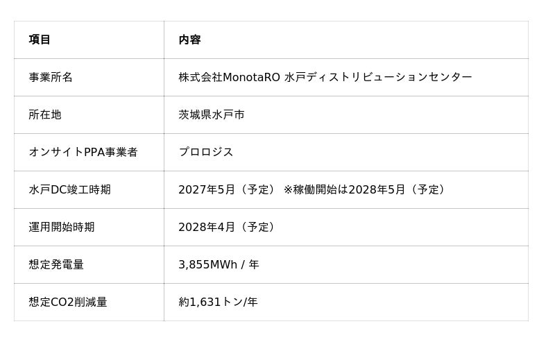 本取り組みは、MonotaROが茨城県水戸市で開発中の「水戸ディストリビューションセンター(以下、水戸DC)」の屋根面に太陽光パネルを設置するものです。自社保有の物流施設として「オンサイトPPAモデル」を採用するのは初めての取り組みであり、2028年4月の運用開始時点において、最大規模の太陽光発電設備となる見込みです。