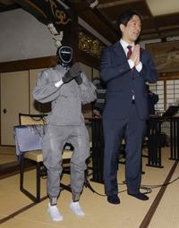 京都市東山区の青蓮院門跡でブッダロイドを報道関係者らに公開。研究グループの熊谷誠慈教授が試しに「人間関係がうまくいかない」と問いかけると、ブッダロイドは「相手との距離を見つめ直し、心のバランスを保つと改善につながる」と答え、合掌した。