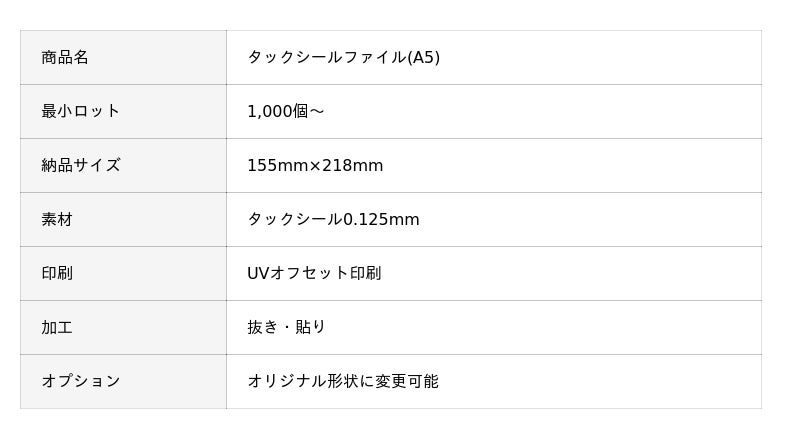 『タックシールファイル(A5)』はクリアなシール素材を使用したクリアファイルです。全面フルカラー印刷可能で、キャラクターを入れたデザインがおすすめです。変わり種の文房具としていかがでしょうか。