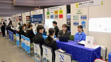 スマホ見せてグルメ・買い物お得に 岐阜新聞デジタルクーポン県と産学金官連携人材育成・定着プロジェクト推進協議会が主催。企業は日替わりで出展し、初日は製造、建設、サービス、流通・小売、金融、官公庁などの企業ブースが並んだ。