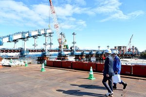 2021年5月の豪雨で橋脚が傾き、通行止めが続いている各務原市の木曽川に架かる川島大橋で26日、同市の浅野健司市長が橋桁の架設が行われている復旧工事現場を視察した。岐阜国道事務所の宮本久仁彦所長は「工事は順調に進んでいる」としている。