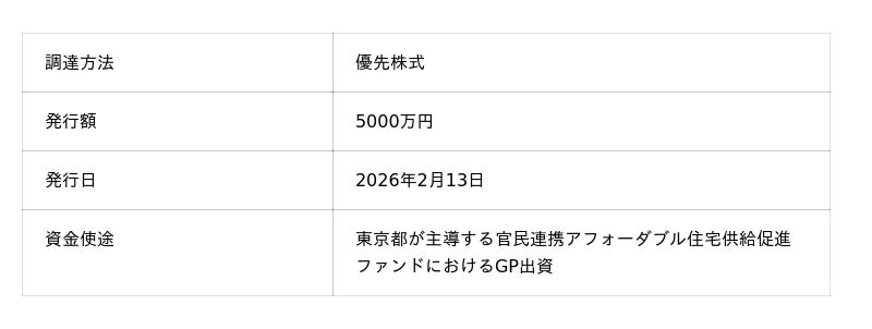 本調達は、当社が運営事業者(無限責任組合員、以下「GP」)として選定された「東京都・官民連携アフォーダブル住宅供給促進ファンド」の運営基盤を強化するためのものであり、国内初(※1)の「GP出資連動型トラッキングストック」を活用したスキームとなります。