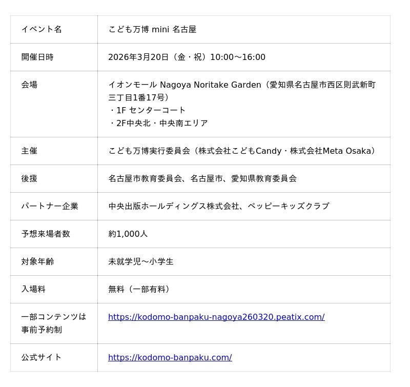 こども万博実行委員会(株式会社こどもCandy、株式会社Meta Osaka)は、2026年3月20日(金・祝)、イオンモール Nagoya Noritake Garden(名古屋市西区)にて、子どもたちの夢を応援するイベント「こども万博 mini 名古屋」を開催します。名古屋市の調査によると、10代の自己肯定感が成長とともに低下し、体験活動への参加阻害要因として「情報を知らない」が23.7%に上ることが明らかになっています。本イベントは、身近な商業施設で気軽に参加できる「夢を見つけるきっかけ」を提供し、子どもたちの主体性と自己肯定感を育むことを目的としています。