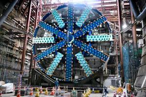 JR東海は27日、相模原市緑区で建設が進むリニア中央新幹線神奈川県駅(仮称)の工事現場で、直径約14メートルの大型掘削機「シールドマシン」を報道陣に公開した。昨年6月から組み立てを始め、今月24日に完成した。