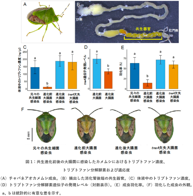 国立研究開発法人産業技術総合研究所(以下「産総研」という)モレキュラーバイオシステム研究部門 バイオシステム多様性研究グループの汪 亜運 産総研特別研究員、森山 実 主任研究員、古賀 隆一 上級主任研究員、深津 武馬 首席研究員は、独自に開発したチャバネアオカメムシ-大腸菌実験共生進化系を駆使して、単一の酵素遺伝子(トリプトファン分解酵素)の機能喪失のみで、大腸菌がカメムシの腸内に共生して成長および生存を支える共生細菌に変化することを発見しました。トリプトファン分解酵素の喪失は、必須アミノ酸であるトリプトファンの濃度上昇、ならびに当該酵素の代謝産物として生成する毒性のあるインドールの濃度低下により、宿主カメムシの生育を改善することを示しました。さらに自然界に存在する多様なカメムシ類の生存を支持する能力を持つ腸内共生細菌のゲノムを調べたところ、トリプトファン分解酵素遺伝子を喪失していることが判明しました。そのような細菌にトリプトファン分解酵素遺伝子を導入して発現させるとカメムシに共生して成長と生存を支える能力(共生能力)が低下すること、またそれらの細菌とごく近縁でトリプトファン分解酵素遺伝子を持つ細菌から当該遺伝子を除去すると共生能力が向上することを示しました。すなわち、細菌におけるトリプトファン分解酵素の喪失が、研究室における実験共生進化のみならず、自然界のカメムシ類における共生進化でも重要な役割を果たしてきたことを明らかにしました。