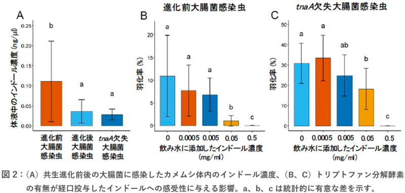 トリプトファン分解酵素はトリプトファンをピルビン酸、アンモニア、インドールに分解する反応を触媒します(概要図)。インドールには毒性があり、マウスやヒトでは腸内細菌のトリプトファン分解酵素によるインドールの産生により病気が引き起こされるという報告があります。共生進化前後の大腸菌を感染させたカメムシにおいて、体内インドール濃度を測定したところ、共生進化後の大腸菌を感染させたカメムシにおいてインドール濃度が有意に低下しており、トリプトファン分解酵素遺伝子を欠失させた大腸菌を感染させたカメムシでも同様にインドール濃度の低下が見られました(図2A)。試しに、進化前またはトリプトファン分解酵素遺伝子を欠失させた大腸菌を感染させたカメムシの幼虫にインドールを添加した飲み水を与えてみたところ、インドールの濃度が高くなるほど羽化率が低下しました(図2B、C)。さらに、トリプトファン分解酵素の欠失により羽化率の低下が緩和されました(図2B、C)。すなわち、トリプトファン分解酵素遺伝子の機能喪失により、毒性のあるインドールが産生されなくなることが、大腸菌の共生細菌化に関与している可能性が示唆されました。
