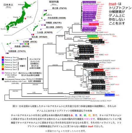 先行研究より、チャバネアオカメムシの日本集団では、その共生器官内にパントエア属(Pantoea)の6種の共生細菌のいずれかを保有することが知られています。他のカメムシ科やキンカメムシ科の多くの種も共生器官に近縁のパントエア属細菌を共生させています。さらに、カメムシ生息域の環境土壌中にはチャバネアオカメムシへの共生能力を持つパントエア属細菌の存在が報告されています(2016年1月11日 産総研プレス発表)。これら自然界で進化した、カメムシへの共生能力を持つ多様な細菌のゲノム配列を決定したところ、ことごとくトリプトファン分解酵素遺伝子を喪失していることが判明しました(図3)。
