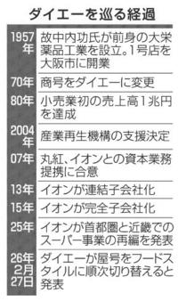 「ダイエー」首都圏で幕 創業70年 イオン、新屋号で再編 近畿も8割切り替えへ 2026年2月28日 05:00 ダイエーのロゴ=東京都江東区 イオン傘下の食品スーパー、ダイエ... 残り644文字(全文:661文字) この記事をお読みいただくには「デジタルプラン」または「宅配+デジタルプラン」の会員登録が必要です。無料会員の方はログインしてマイページからコース変更してください。デジタルプランまたは宅配+デジタルプランをご登録中の方はログインしてください。 岐阜新聞デジタル会員に登録すると 無料会員向け記事が読める ニュースレターで最新情報が受け取れる デジタルプラン、宅配+デジタルプランなら Webオリジナルコンテンツが読める 紙面ビューアが読める チケットの先行発売に参加できる お得なクーポンが使える 新規登録ページ ログインページ トップ 岐阜のニュース 「ダイエー」首都圏で幕 創業70年 イオン、新屋号で再編 近畿も8割切り替えへ 関連記事 ぎふ健康日和 8、9面 岐阜地裁、被告の人権保護で配慮 傍聴人入廷前に解錠 最高裁通達 手錠・腰縄姿を見せず 物流実験ドローン墜落 日本郵便、協定を延期 兵庫の山中 外国人摘発4割減 全国21~25年 岐阜は3割超減 大阪の住宅で80代男女死亡 息子か、殺人容疑で逮捕 当番弁護士の登録率が最低 都市部で減少顕著 25年全国 おすすめ記事 FC岐阜4連勝 開幕からJ2勢連破止まらず 百年構想リーグ 本巣消防署が新築移転、竣工式 岐阜地域の消防広域化で4月運用スタート 山岳救助想定の訓練施設も ぶんけいカップ岐阜県少年サッカー大会が開幕 決勝トーナメント進出の8強決まる 気温「40度以上」何と呼ぶ 新名称、暑い岐阜県民なら想像しやすい? 気象庁がアンケート開始