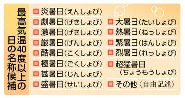 40度以上名称選んで 今夏導入 気象庁がアンケート開始 2026年2月28日 05:00 気象庁は27日、最高気温が40度... 残り401文字(全文:418文字) この記事をお読みいただくには「デジタルプラン」または「宅配+デジタルプラン」の会員登録が必要です。無料会員の方はログインしてマイページからコース変更してください。デジタルプランまたは宅配+デジタルプランをご登録中の方はログインしてください。 岐阜新聞デジタル会員に登録すると 無料会員向け記事が読める ニュースレターで最新情報が受け取れる デジタルプラン、宅配+デジタルプランなら Webオリジナルコンテンツが読める 紙面ビューアが読める チケットの先行発売に参加できる お得なクーポンが使える 新規登録ページ ログインページ トップ 岐阜のニュース 40度以上名称選んで 今夏導入 気象庁がアンケート開始 関連記事 ぎふ健康日和 8、9面 岐阜地裁、被告の人権保護で配慮 傍聴人入廷前に解錠 最高裁通達 手錠・腰縄姿を見せず 物流実験ドローン墜落 日本郵便、協定を延期 兵庫の山中 外国人摘発4割減 全国21~25年 岐阜は3割超減 大阪の住宅で80代男女死亡 息子か、殺人容疑で逮捕 当番弁護士の登録率が最低 都市部で減少顕著 25年全国 おすすめ記事 FC岐阜4連勝 開幕からJ2勢連破止まらず 百年構想リーグ 本巣消防署が新築移転、竣工式 岐阜地域の消防広域化で4月運用スタート 山岳救助想定の訓練施設も ぶんけいカップ岐阜県少年サッカー大会が開幕 決勝トーナメント進出の8強決まる 気温「40度以上」何と呼ぶ 新名称、暑い岐阜県民なら想像しやすい? 気象庁がアンケート開始